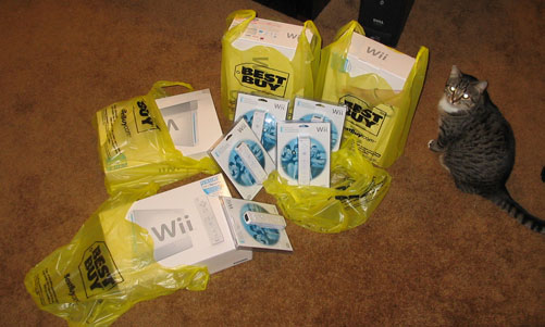 Seen here are four convention Wiis, in addition to five additional Wii-motes (for the one additional system we have pre-ordered and will pick up later today). We will be acquiring Nunchuks, Classic Controllers, and component cables shortly, but they were out of stock today. Staff get to play with our Wiis at special events such as the holiday party. The rest of you get to play them at the con.