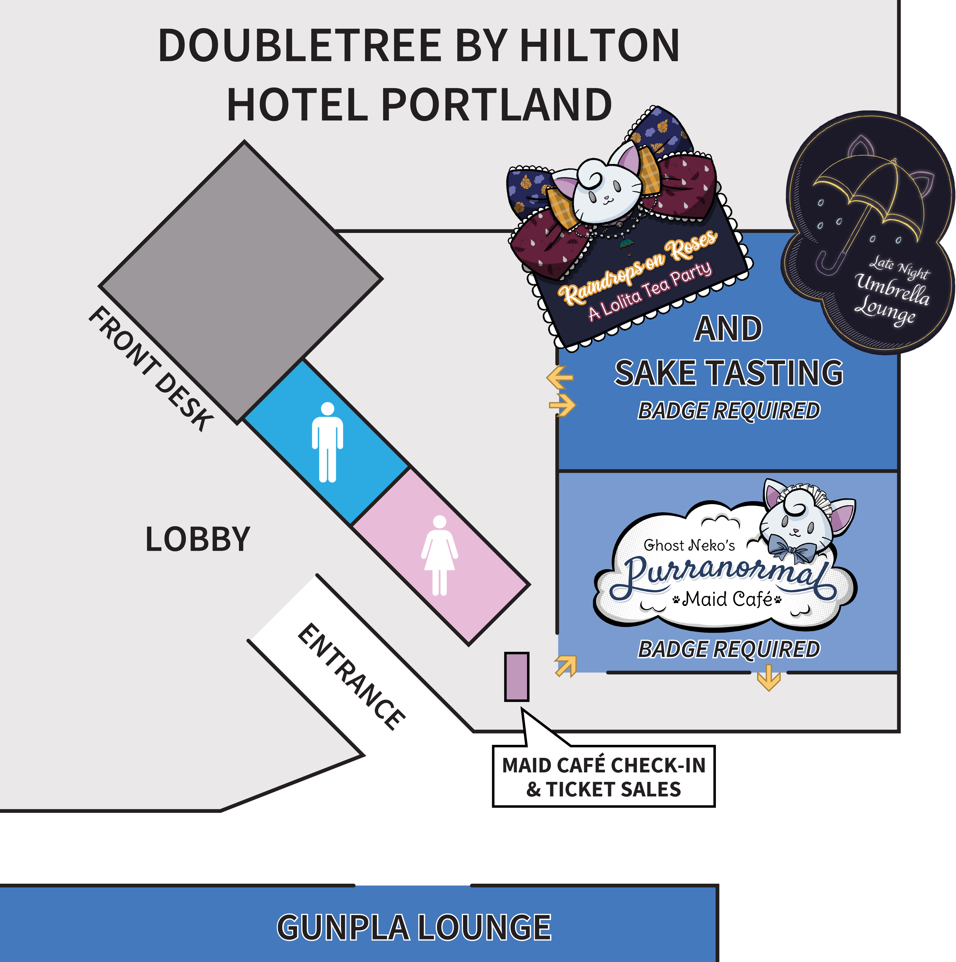We kindly invite you to Kumoricon's premier Maid Café at the DoubleTree by Hilton, with sessions running Friday through Sunday afternoon. Each session combines a sampling of a Japanese maid cafe experience with the community of an American convention, presented as a special dining event.